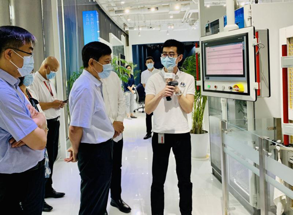 许强一行参观了西门子数字化企业展厅,现场体验从客户下单、产品虚拟设计、产品虚拟生产到实际生产线产品下线的全流程产品生产。该产线是全球第一条展示完整工业4.0解决方案的示范线,可实现客户现场下单、产线柔性现场生产、产品数据全生命周期追溯;通过虚拟产品模型构建与实际产品设计结合、虚拟生产流程与实际柔性生产结合的“数字孪生”智能制造,对生产流程及控制程序提前进行验证,大大节省产线设计的周期和试生产投资。