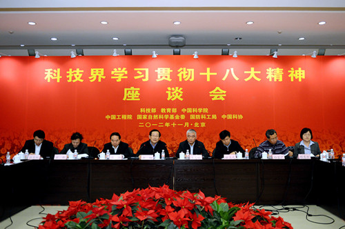11月23日,科技界学习贯彻党的十八大精神座谈会在京举行。座谈会由科技部党组书记、副部长王志刚主持。全国政协副主席、科技部部长万钢和教育部、中科院、工程院、自然科学基金会、中国科协、国防科工局负责同志以及来自科研院所、高校和企业的代表,分别在座谈会上发言,畅谈了学习宣传贯彻党的十八大精神的想法和建议。