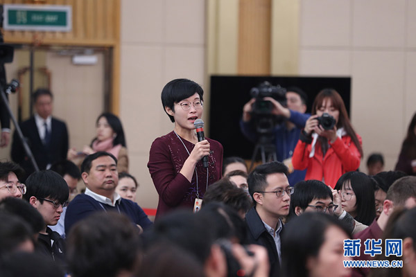 十三届全国人大二次会议新闻中心3月11日(星期一)8时45分在梅地亚中心新闻发布厅举行记者会,邀请科技部部长王志刚、副部长李萌、战略规划司司长许倞、政策法规与创新体系建设司司长贺德方、资源配置与管理司司长张晓原就“加快建设创新型国家”相关问题回答中外记者提问。图为科技日报记者提问。新华网/中国政府网 刘厦 摄