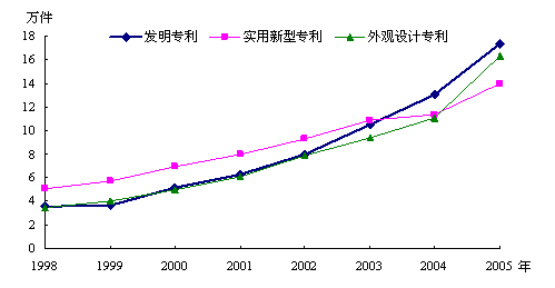 图1 1998-2005年我国三类专利申请量变化情况