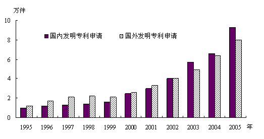 图2 1995-2005年我国发明专利的国内外申请量变化