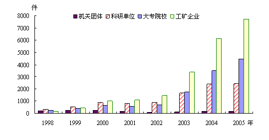 2005年在国内职务发明专利申请中,企业申请40196件,大专院校申请14643件,科研单位申请6726件,机关团体申请705件,较上年分别增长了48.7%、51.2%、48.1%和42.4%。可见,国内各类机构职务发明专利申请增长速度都很快。