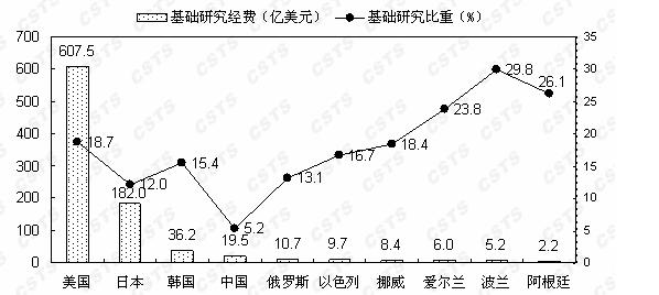 2006年,我国R&D经费支出总额中用于基础研究的经费为19.5亿美元,比上年增长了3.5亿美元,在公布数据的17个国家中属中等水平,高于以色列、俄罗斯。但仅为美国的3.2%,日本的10.7%,韩国的基础研究经费是我国的1.9倍。