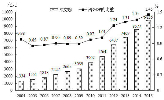图1 全国技术合同成交金额及其占GDP的比重(2004-2015年)