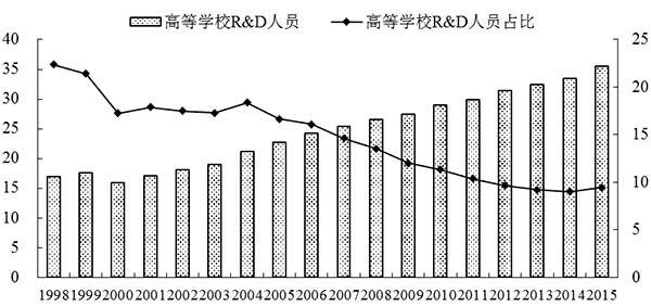 图1 高等学校R&D人员及其占全国R&D人员的比重(1998-2015年)