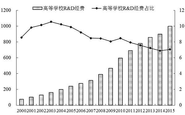 图2 高等学校R&D经费及其占全国R&D经费的比重(1998-2015年)