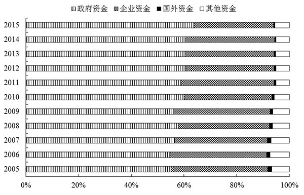 图3 高等学校R&D经费来源构成(2005-2015年)