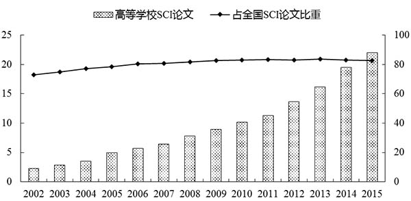图4 高等学校SCI论文及其占全国SCI论文的比重(2002-2015年)