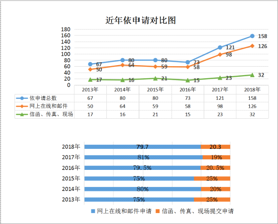 1.申请情况。2018年,共收到政府信息公开申请158件,比2017年增加31%,创历年新高。按申请主体分类,公民依然是申请主力,申请151件,占95.57%,法人和其他组织申请7件,占4.43%。按申请方式分类,网上在线系统申请126件,占79.75%;信函申请31件,占19.62%;现场申请1件。按涉及业务分析,主要包括政策文件、项目情况、财政经费使用情况、科技统计数据等。