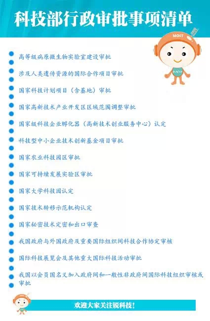 科技部的“权力清单”包括高等级病原微生物实验室建设审批、涉及人类遗传资源的国际合作项目审批等14项。