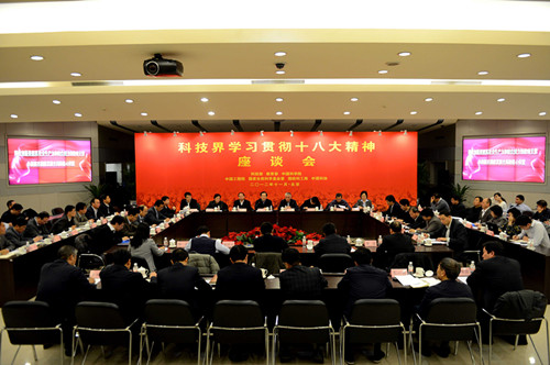 11月23日,科技界学习贯彻党的十八大精神座谈会在京举行。座谈会由科技部党组书记、副部长王志刚主持。全国政协副主席、科技部部长万钢和教育部、中科院、工程院、自然科学基金会、中国科协、国防科工局负责同志以及来自科研院所、高校和企业的代表,分别在座谈会上发言,畅谈了学习宣传贯彻党的十八大精神的想法和建议。