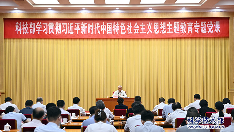 为庆祝中国共产党成立102周年,推动学习贯彻习近平新时代中国特色社会主义思想主题教育走深走实,7月4日上午,科技部党组书记、部长,部主题教育领导小组组长王志刚围绕“学深悟透习近平新时代中国特色社会主义思想 走好推动科技改革发展的第一方阵”讲授专题党课。中央第32指导组组长李微微及有关同志到会指导。部党组成员、副部长,部主题教育领导小组副组长吴朝晖主持会议。部领导张广军、相里斌、高波、张碧涌出席会议。