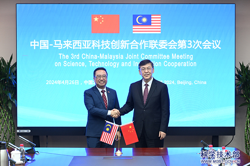 2024年4月26日,中国科技部部长阴和俊会见来访的马来西亚科技创新部部长郑立慷。两国部长共同出席中国-马来西亚政府间科技创新合作联委会第3次会议,签署会议纪要,并见证了相关机构合作文件签署。
