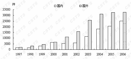 图3 发明专利的国内授权量和国外授权量(1997—2006年)
