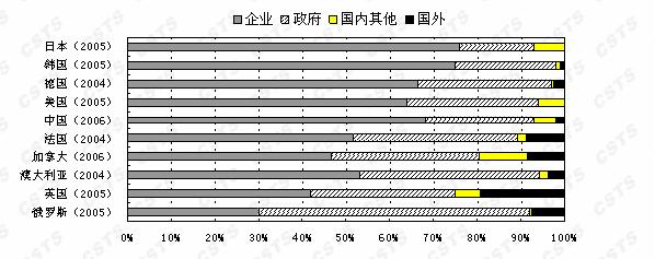 2006年,我国的R&D经费支出总额达到377亿美元,比上年增加78亿美元,继续保持世界第六位。美国和日本分别以3437亿美元和1513亿美元的R&D经费支出额高居世界第一和第二位;德国、法国和英国分别以686亿美元、453亿美元和396亿美元处于世界第三至第五位;加拿大和韩国分别以250亿美元和236亿美元居我国之后,处在世界第七和第八位。从增长速度来看,1996~2006的10年间,我国的R&D经费支出额以年均19.7%的速度增长,远远超过世界主要发达国家增长率水平。
