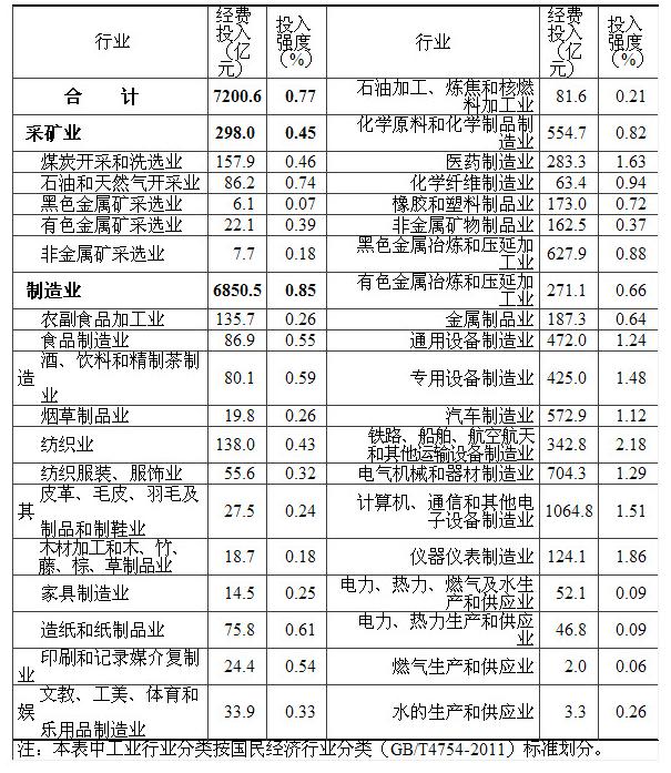 分产业部门*看,研究与试验发展(R&D)经费投入超过200亿元的行业大类有10个,这10个行业的研发费用占全部规模以上工业企业的比重达73.9%;研发经费投入强度(与主营业务收入之比)超过了1%的行业大类有8个(分行业情况详见附表1)。