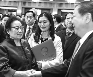 2016年度国家科学技术奖励大会上,大家向获奖的中国中医科学院屠呦呦研究员表示祝贺。新华社发