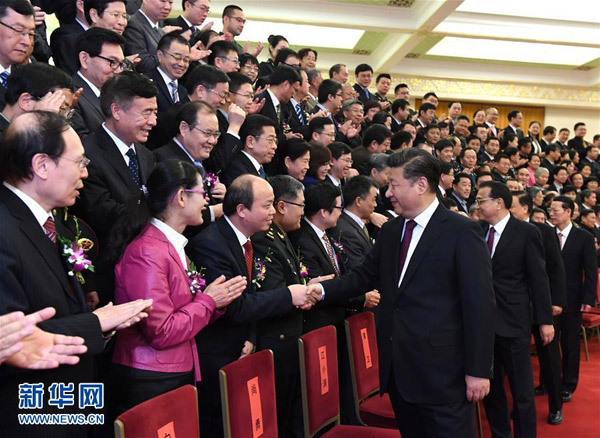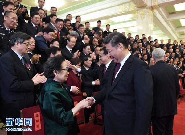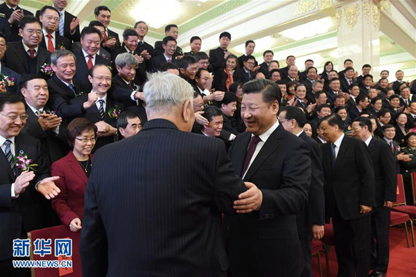1月9日,2016年度国家科学技术奖励大会在北京人民大会堂隆重举行。党和国家领导人习近平、李克强、刘云山、张高丽等出席大会并为获奖代表颁发奖励证书。会前,习近平等党和国家领导人会见获奖代表。新华社记者 李学仁 摄