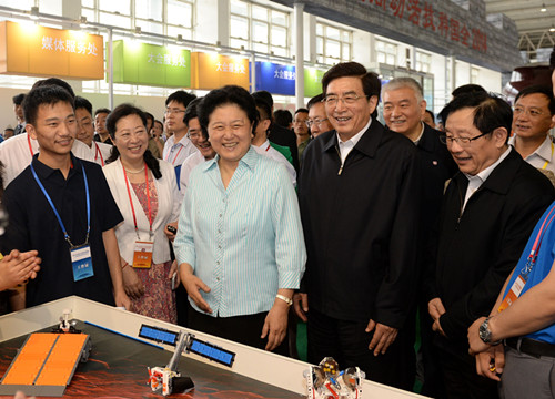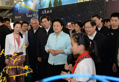 在科普博览现场,炒菜机器人、纳米数码茶几、社区科普体验厅、工程型多用途旋翼式无人驾驶飞行器、大学生创新创业实验室等现场展览项目吸引了众多参观者。在“携手嫦娥,梦圆飞天”青少年设计比赛现场,探月工程总设计师孙家栋院士、航天员王亚平进行了精彩的点评,并与参赛学生进行了互动交流。