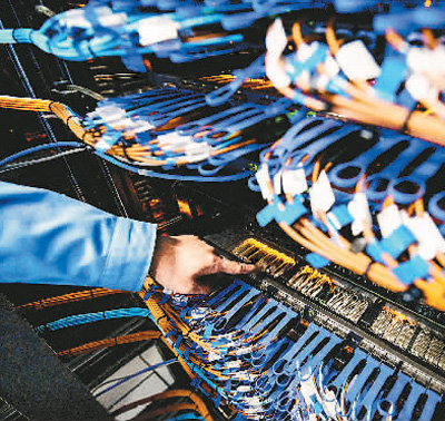 “神威太湖之光”超级计算机的交换机网线。新华社记者 李响 摄