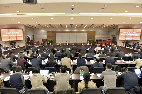 与会同志一致认为,党的十九大是在全面建成小康社会决胜阶段、中国特色社会主义进入新时代的关键时期召开的一次十分重要的大会,在党和国家历史上具有划时代意义。党的十九大报告高屋建瓴,思想深刻,论述精辟,气势恢宏,紧紧抓住坚持和发展中国特色社会主义这条主线,科学判断中国特色社会主义进入新时代,提出了新时代我国社会主要矛盾,阐明了基本方略,描绘了宏伟蓝图,体现为民宗旨,强化从严治党要求,是我们党迈进新时代、开启新征程、续写新篇章的政治宣言和行动指南。大会确立的习近平新时代中国特色社会主义思想,是马克思主义中国化的最新成果,是中国特色社会主义理论体系的重要组成部分,开辟了马克思主义新境界、中国特色社会主义新境界,是我们党必须长期坚持的指导思想。党的十九大报告充分肯定了我国科技创新取得的巨大成就,强调了科技创新在建设社会主义现代化强国中的重要地位和作用,对加快建设创新型国家提出明确部署和要求,为今后一段时期科技事业发展指明了前进方向,提供了根本遵循,科技界和广大科技工作者都深受鼓舞和激励,深感责任重大,使命光荣。