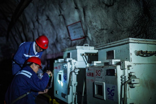 贵州盘江精煤股份有限公司山脚树矿工作人员在井下检查5G基站控制器运行情况(2022年5月18日摄)。新华社记者 陶亮 摄