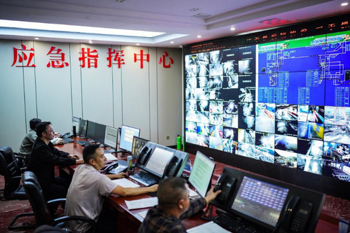 贵州盘江精煤股份有限公司山脚树矿矿长王海涛(左二)与管理人员在应急指挥中心进行综合调度(2022年5月18日摄)。新华社记者 陶亮 摄