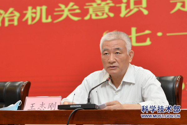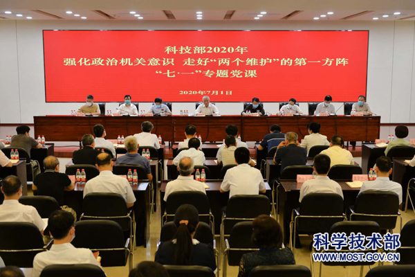 2020年7月1日下午,科技部举行庆祝中国共产党建党99周年主题党日活动,部党组书记、部长王志刚以“强化政治机关意识、走好‘两个维护’第一方阵”为主题讲党课,在京部领导出席会议,党组成员、副部长、机关党委书记李萌主持。