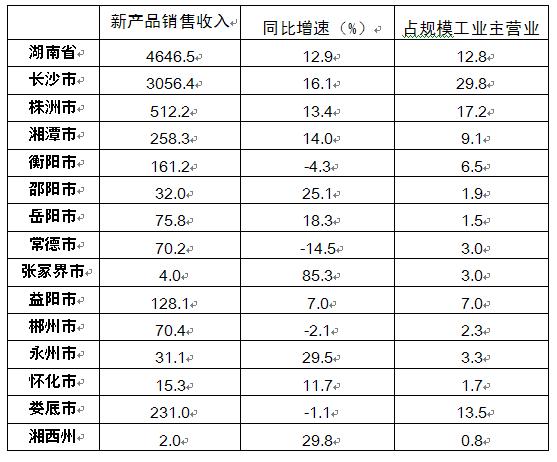 按地区来看,长沙、株洲、湘潭三市分别实现工业新产品销售收入3056.4亿元、512.2亿元和258.3亿元,长株潭地区新产品销售收入占全省总额的82.4%,长株潭地区为全省产业技术自主创新的聚集区。