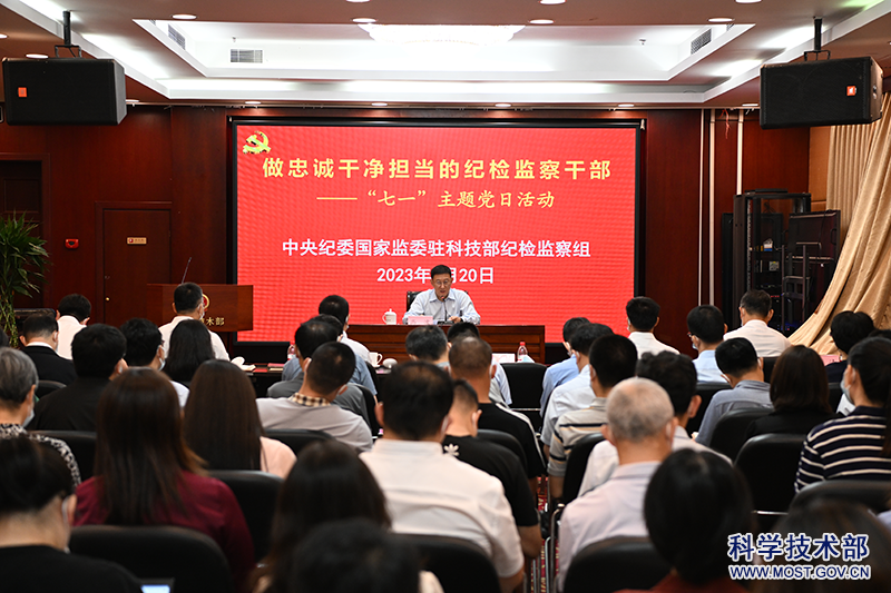 按照学习贯彻习近平新时代中国特色社会主义思想主题教育、全国纪检监察干部队伍教育整顿的部署安排,为进一步加强派驻机构和综合监督单位内设纪检机构思想政治建设,教育引导纪检监察干部不忘初心、牢记使命,2023年6月20日,驻科技部纪检监察组围绕“做忠诚干净担当的纪检监察干部”,组织开展“七一”主题党日活动。纪检监察组组长高波出席并讲授专题党课。纪检监察组全体党员干部和科技部、工程院、自然科学基金委、科技日报社、中国科协等5家综合监督单位机关纪委及各直属单位纪检干部共100余人参加。